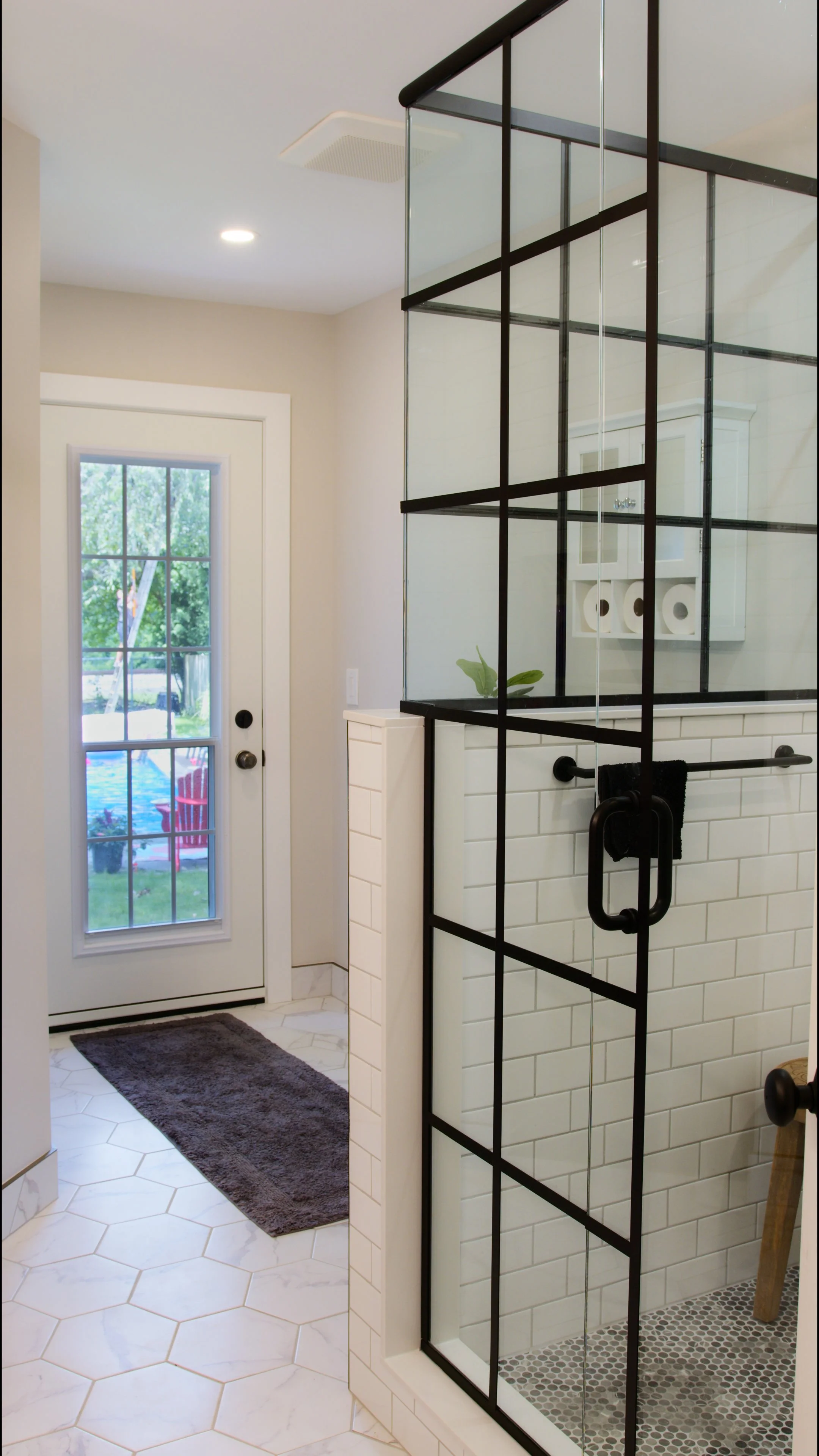 This bathroom renovation brought both structural updates and elevated design. The shower was relocated and the area reframed to improve layout and flow, complete with custom shower glass and a striking black accent trim. A new exterior doorway enhances natural light and accessibility, while fresh tile throughout adds a clean, cohesive look. A tiled half wall and built-in shower niche provide smart storage and visual interest. Lightly stained wood cabinetry paired with a matching quartz countertop anchors the space, and black hardware and plumbing fixtures offer a bold, modern contrast that ties everything together.